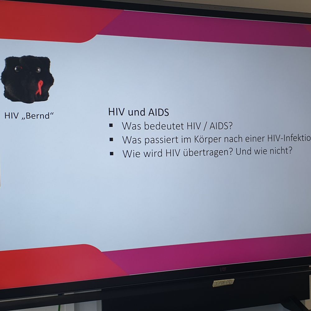 Wie sich das HI-Virus übertragen lässt wurde geklärt, auch was getan werden kann, wenn mal ein Kondom beim Sex reißt. Worauf es beim HIV-Test ankommt und wie so ein Test funktioniert, haben die Schüler:innen erfahren. Mit einem Filmbeitrag und einigen Fragen ging es dann darum, wie ein Leben mit HIV aussehen kann. Was läuft gut? Wo gibt es Schwierigkeiten? In welchen Fällen erleben HIV-positive Menschen noch immer Diskriminierung? Was bedeutet die rote Schleife? Und wo kann ich mich beraten lassen, wenn ich Fragen zum Thema habe?
